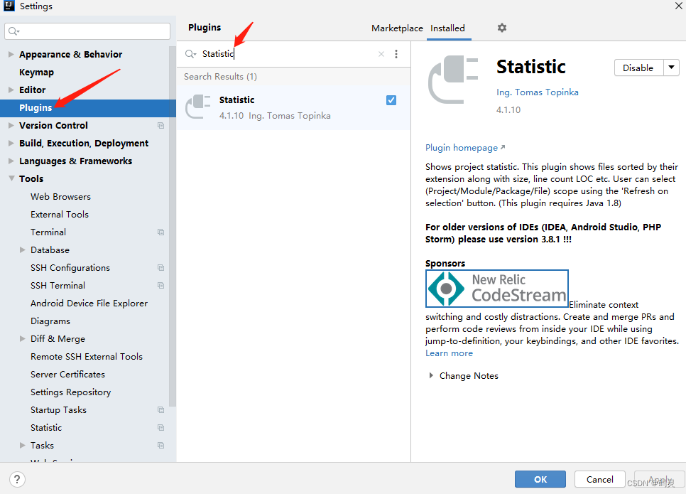 使用Statistic统计代码行数 一、安装Statistic二、使用Statistic三、遇到的问题 一、安装Statistic 1、打开IDEA 2、打开settings进行设置 3、选择plugins,进行插件安装 4、搜索Statistic并安装 5、下载完成之后,重启IDEA,此时Statistic就…