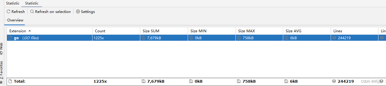 一、打开 AS -> File -> Settings -> Plugins,搜索statistic,在线安装即可 二、安装完成后,在AS底部找到Statistic 三、点击Statistic,打开界面,如果没有数据,点击Refresh按钮刷新