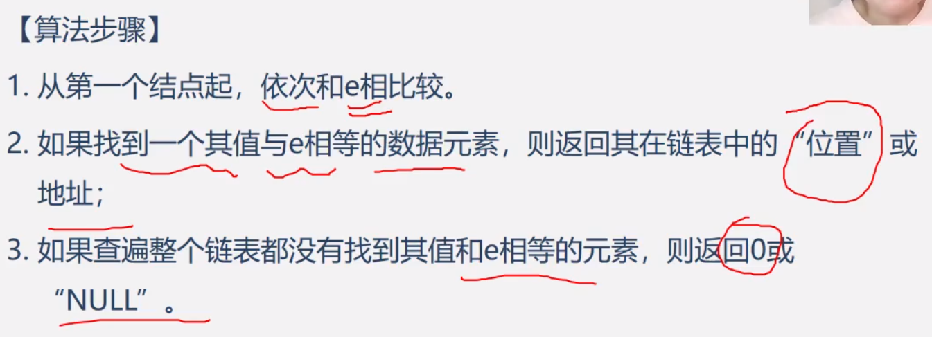 {Lnode* p;int k = 1; //用来计数p = L->next; //从首元结点开始找while((p != NULL)&&(e != p->data)){p = p->next;k++;}if(e == p->data)return k; //找到了,返回位置序号elsereturn ERROR; //else就是p为NULL,找不到