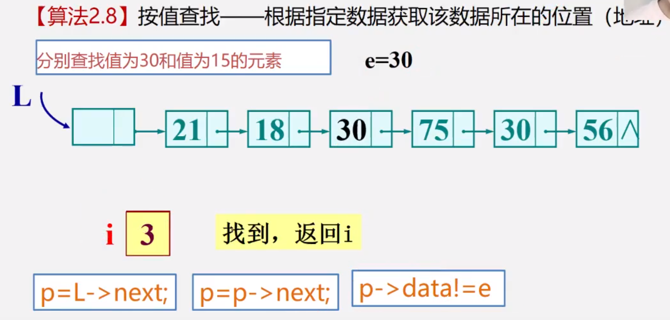 {Lnode* p;p = L->next; //从首元结点开始找while((e != p->data)&&(p != NULL)){ p = p->next;}return p; //若找不到,就意味着p为NULL,此时返回NULL。找到了,返回的p就是数据所在地址