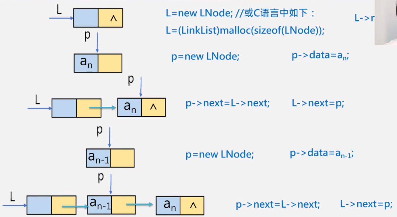 {int i;Lnode* p;L = (Linklist)malloc(sizeof(Lnode)); //给头指针分配空间,也就是创建头结点L->next = NULL; //最开始是空表,所以没有首元结点的地址L->next为NULLfor(i = n; i>0; i--) //循环n次,创建n个结点{p = (Lnode*)malloc(sizeof(Lnode)); //p作为新结点scanf("%d",&p->data); //让用户输入数据p->next = L->next; //将L后面的结点(头结点后的结点)连在p的后面L->next = p; //将p插在头部作为首元结点}
