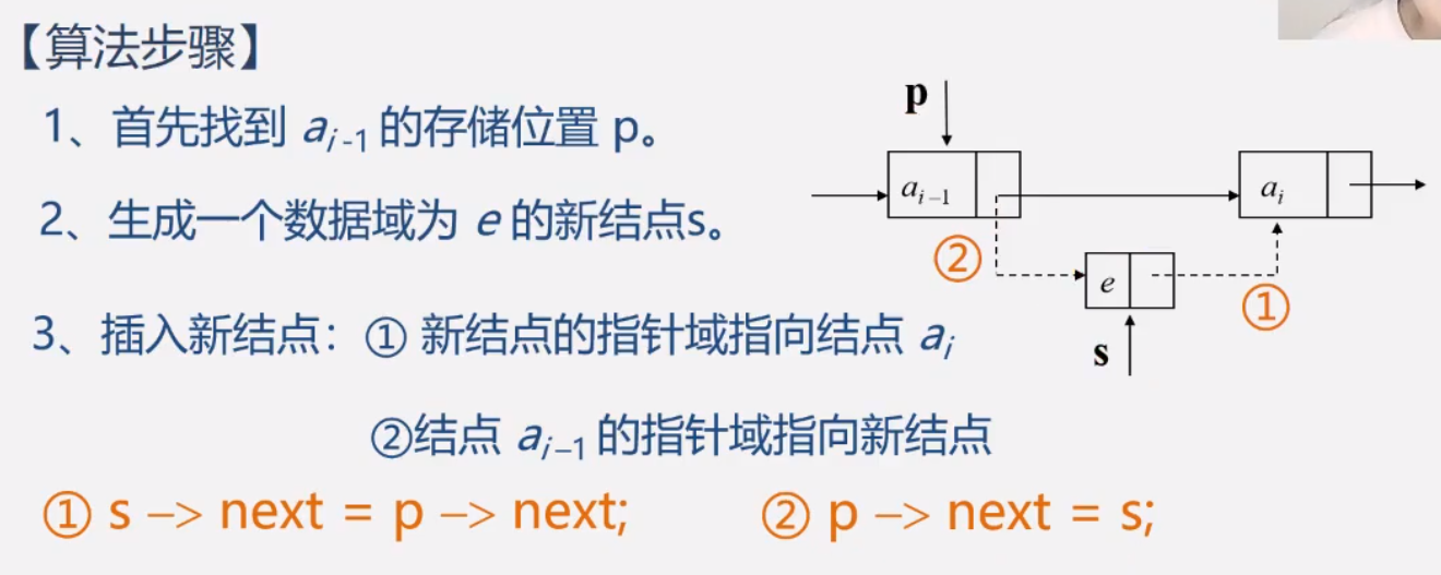 {int j = 1; //用来计数Lnode* p, *s; //s用来指向新加入的结点p = L; //从头结点开始,因为如果是在第1个元素之前插入,就应该是在头结点的后面插入while((p != NULL)&&(j<pos)) /* j=pos时循环结束,此时表示找到了,且p指向的是pos的前一个结点。或者,当p=NULL时循环结束,表示找不到*/{p = p->next; //找下一个结点j++;}if((p == NULL)||(j>pos)) /* pos不能为0或负数,所以j>pos是return ERROR。且pos不能大于表长,当pos大于表长的情况就是循环结束后p==NULL,此时应return ERROR*/return ERROR; s = (Linklist)malloc(sizeof(Lnode)); //给新插入的结点开辟空间,用来存放es->data = e; //将e存放在新结点的数据域里s->next = p->next; //将s的指针域指向原来的下一个结点p->next = s; //将p的指针域指向新的结点