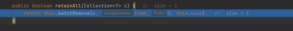 boolean batchRemove(Collection<?> c, boolean complement, int from, int end) {Objects.requireNonNull(c); //获取list2的值Object[] es = this.elementData; // 获取源数据list1中的值for(int r = from; r != end; ++r) { //循环判断list2中是否包含list1的元素,将相同的元素放入list1数组中if (c.contains(es[r]) != complement) { int w = r++; try {for(; r < end; ++r) {Object e;if (c.contains(e = es[r]) == complement) {es[w++] = e;}}} catch (Throwable var12) {System.arraycopy(es, r, es, w, end - r);w += end - r;throw var12;} finally {this.modCount += end - w;this.shiftTailOverGap(es, w, end);}return true;}}return false;}