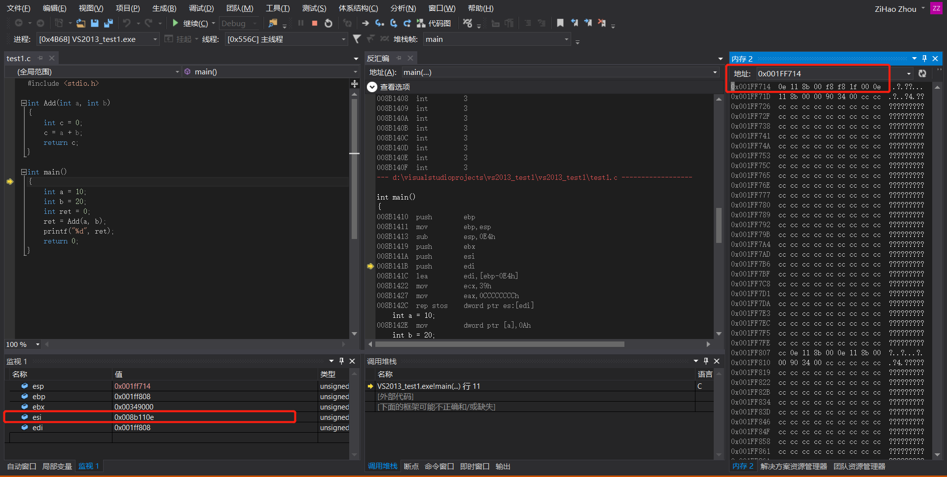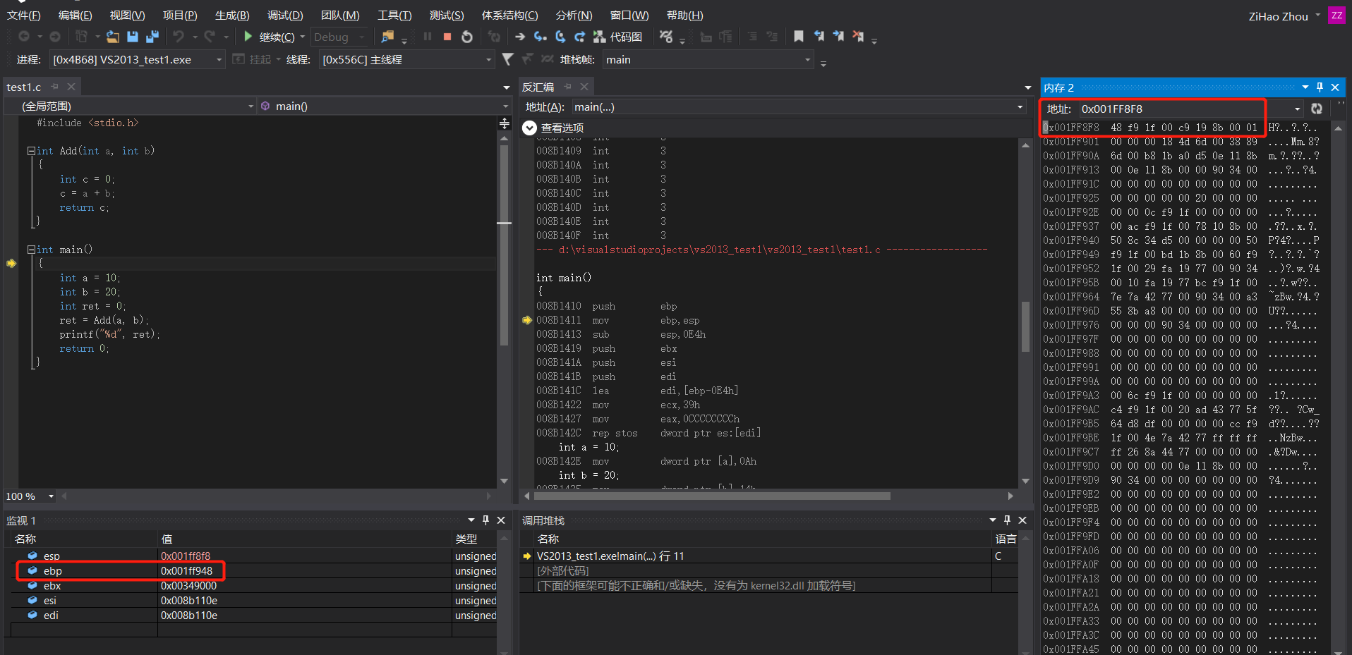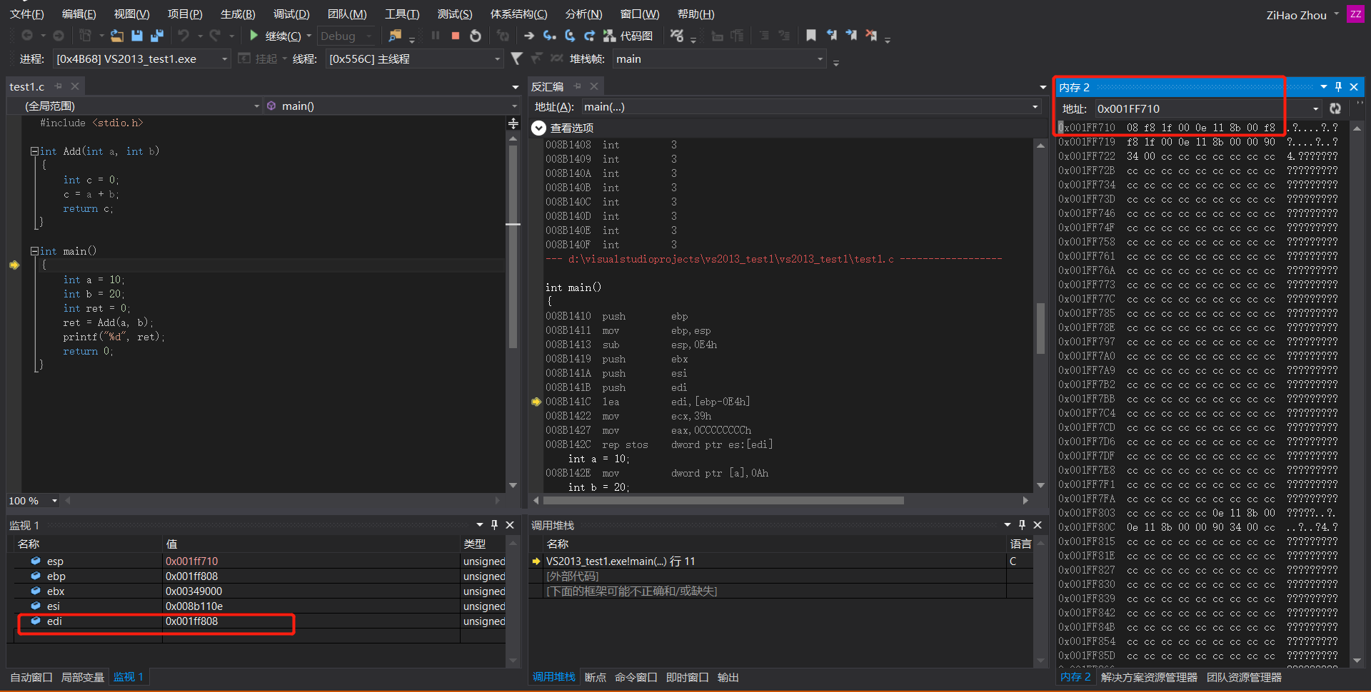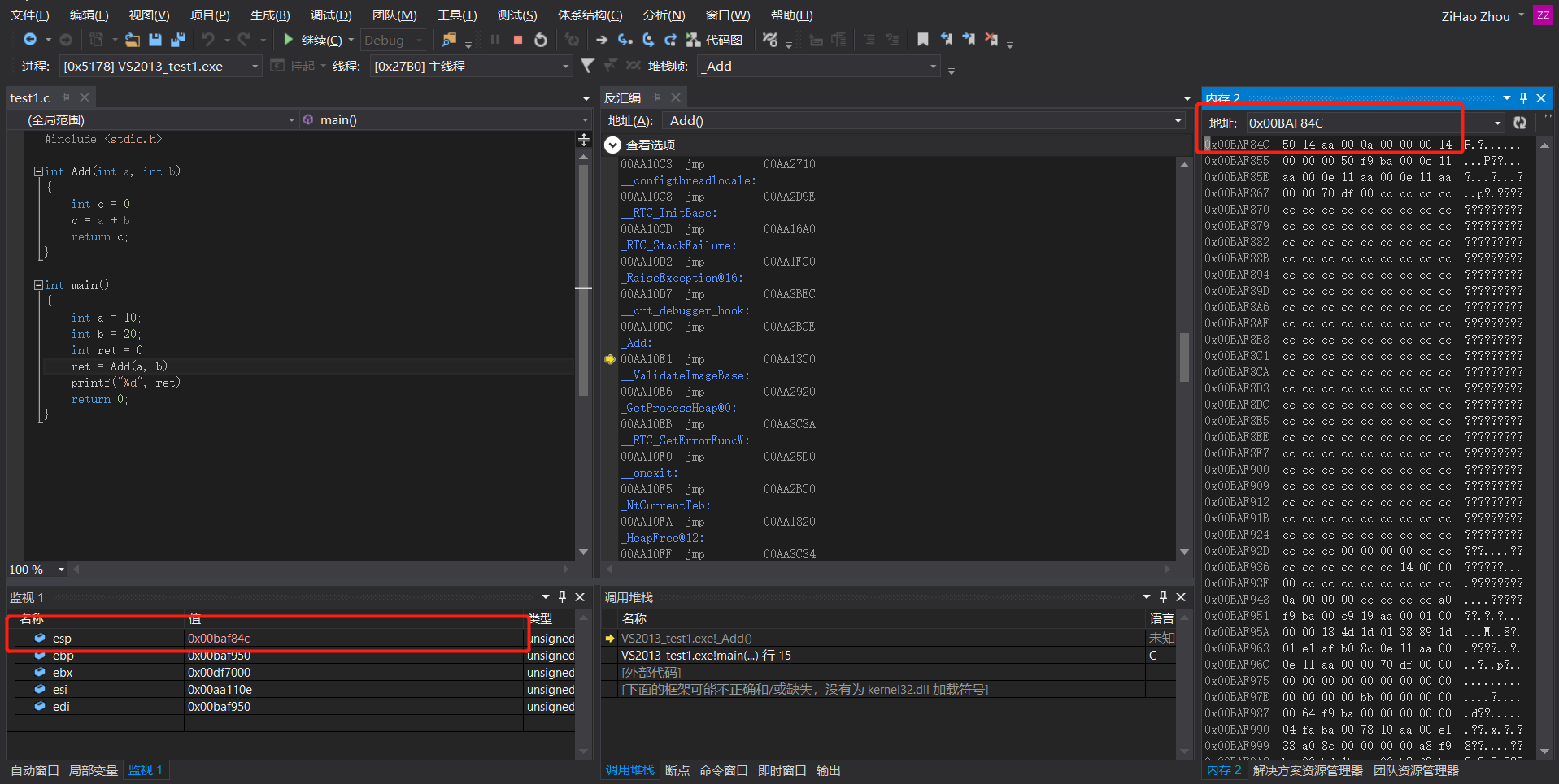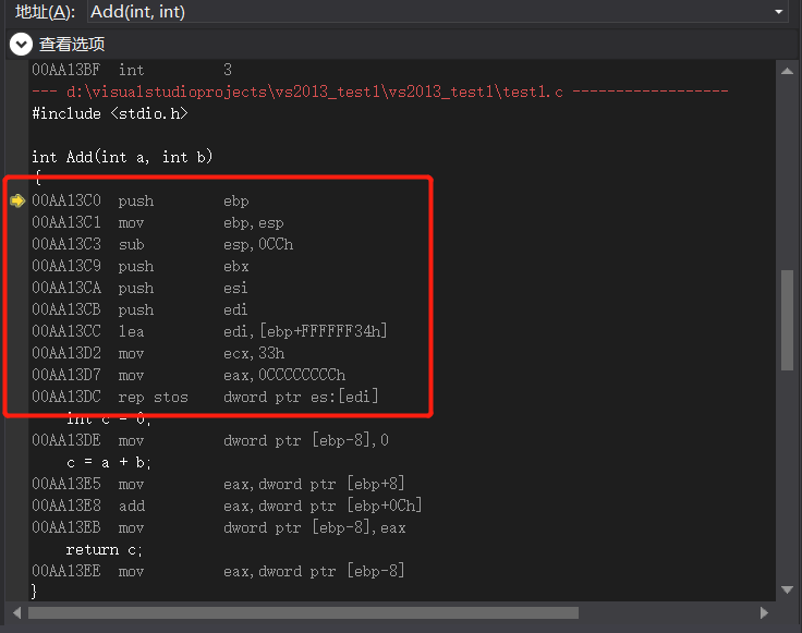 进入Add()函数,可以看出这与此前main函数开辟栈帧的过程类似,说明Add()函数调用又开辟了一块独立的栈帧。
