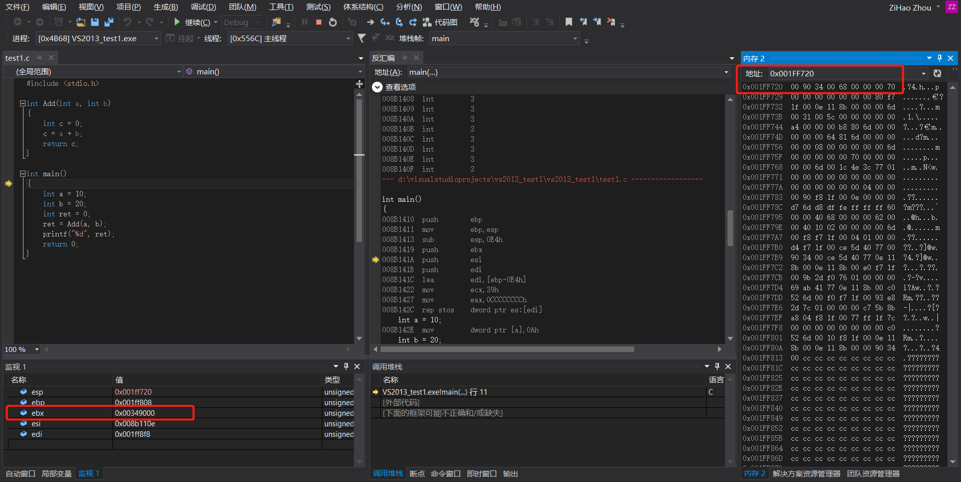 很显然main函数在被调用时,创建了栈帧。在调试过程中将转到反汇编,便能直观的看到main函数栈帧创建的过程。首先需明确的是,函数栈帧由寄存器esp,ebp维护。