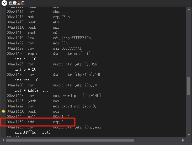 - 将(ebp + 8)的值传递给eax,此时的ebp存放Add函数的栈底指针,(ebp + 8) 的位置即函数传参时创建的ecx的地址,其内部存放的正是10。
