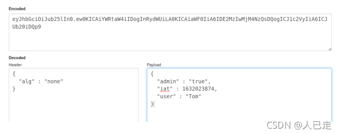看到admin项为false,修改一下admin的值,再改一下alg为none,不加密