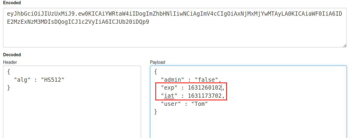 在token中还设置了token的生效时间,只有1分钟,所以在爆出available之后,可能时间就不够了,这时候手动修改一下这里的数字(该处使用的是unix时间戳,可以百度看现在的时间,然后修改)让现在的时间处于两者之间,再提交就能通过了