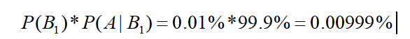 可知一人检测出来为阳性,并且它患贝叶死的概率为 P(B1∩A),它可以通过: