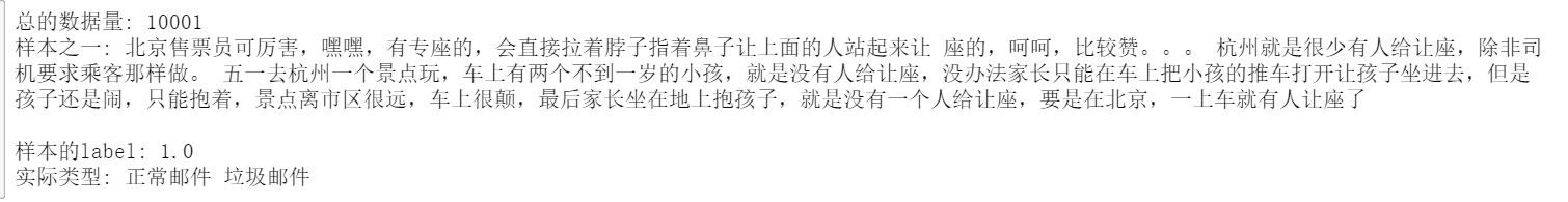 def get_data():with open("E://laji//ham_data.txt", encoding="utf8") as ham_f, open("E://laji//spam_data.txt", encoding="utf8") as spam_f:# 正常的邮件数据ham_data = ham_f.readlines()# 垃圾邮件数据spam_data = spam_f.readlines()# 正常数据标记为1ham_label = np.ones(len(ham_data)).tolist()#将数组或者矩阵转化成列表# 垃圾邮件数据标记为0spam_label = np.zeros(len(spam_data)).tolist() # 数据集集合corpus = ham_data + spam_data# 标记数据集合labels = ham_label + spam_label