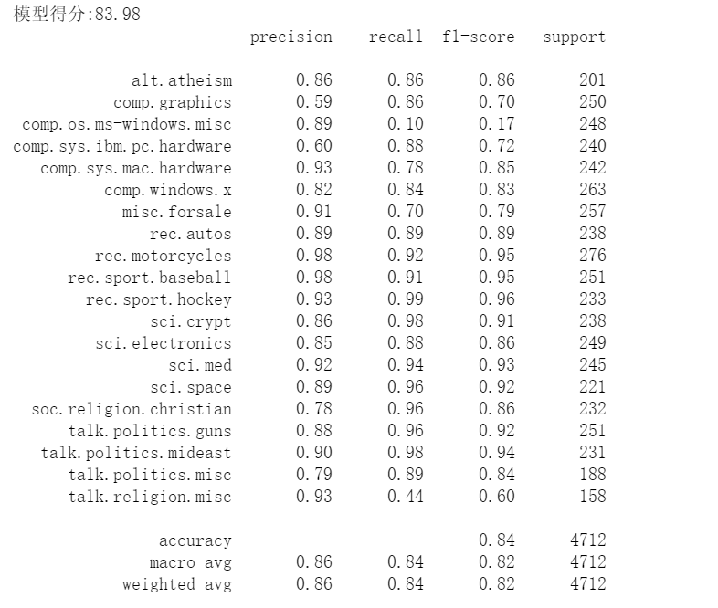 从上图中可以看出,朴素贝叶斯模型对4712条测试样本新闻进行分类的精确率为83.98%,平均的精确率(0.86)、召回率 (0.84)和 F1指标(0.82) 都在0.8以上,效果还不错。