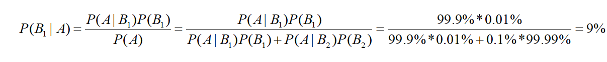 已知: 患有贝叶死的情况下,测出为阳性的概率为 P(A|B1)=99.9%;没有患贝叶死,但测出为阳性的概率P(A|B2)=0.1%.在群体中,一个人患贝叶斯死的概率为0.01%,不患的概率为99.99%.