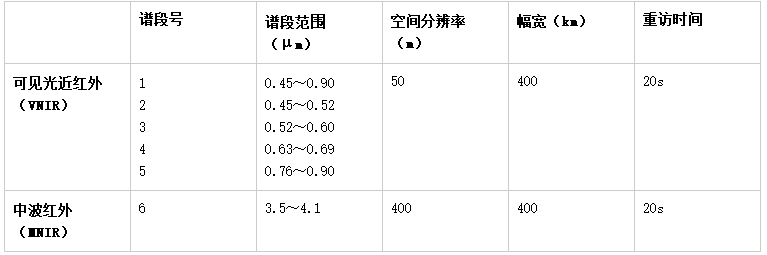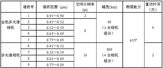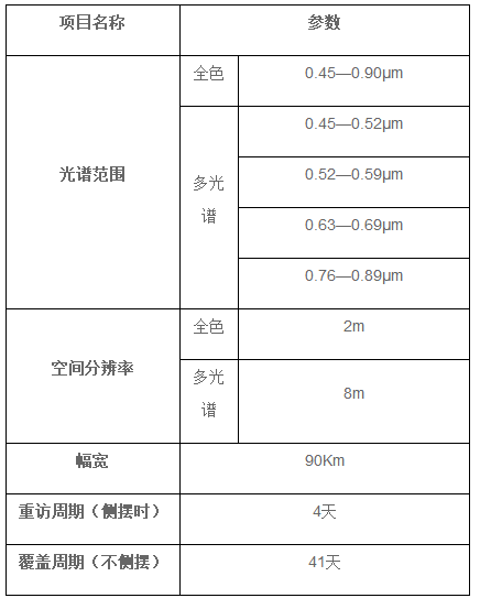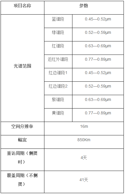 高分六号卫星配置2米全色/8米多光谱高分辨率相机、16米多光谱中分辨率宽幅相机,2米全色/8米多光谱相机观测幅宽90公里,16米多光谱相机观测幅宽800公里。