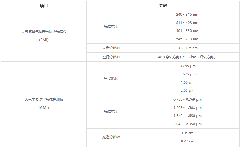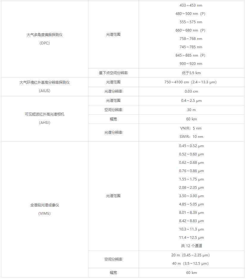 高分五号一共有6个载荷,分别是可见短波红外高光谱相机、全谱段光谱成像仪、大气主要温室气体监测仪、大气环境红外甚高光谱分辨率探测仪、大气气溶胶多角度偏振探测仪和大气痕量气体差分吸收光谱仪。可对大气气溶胶、二氧化硫、二氧化氮、二氧化碳、甲烷、水华、水质、核电厂温排水、陆地植被、秸秆焚烧、城市热岛等多个环境要素进行监测。