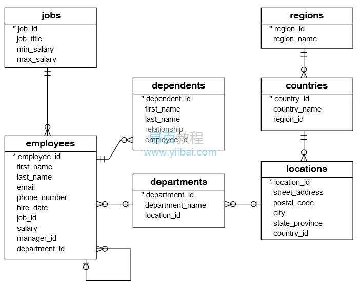 在本教程中,我们将向您介绍在整个教程中使用的SQL示例数据库。以下数据库关系图 - HR 示例数据库: