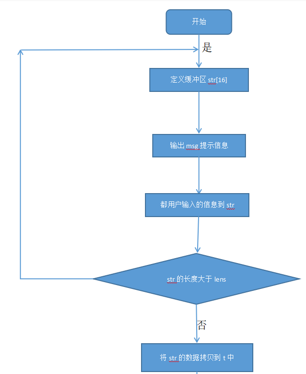 输入字符串时进行长度验证,如果不符合要求则提示信息msg后让用户再次输入。在函数内部定义一个临时缓冲区char str[16],接收用户输入,当输入的字符串长度大于lens时,则再次要求用户输入,并给出提示信息。