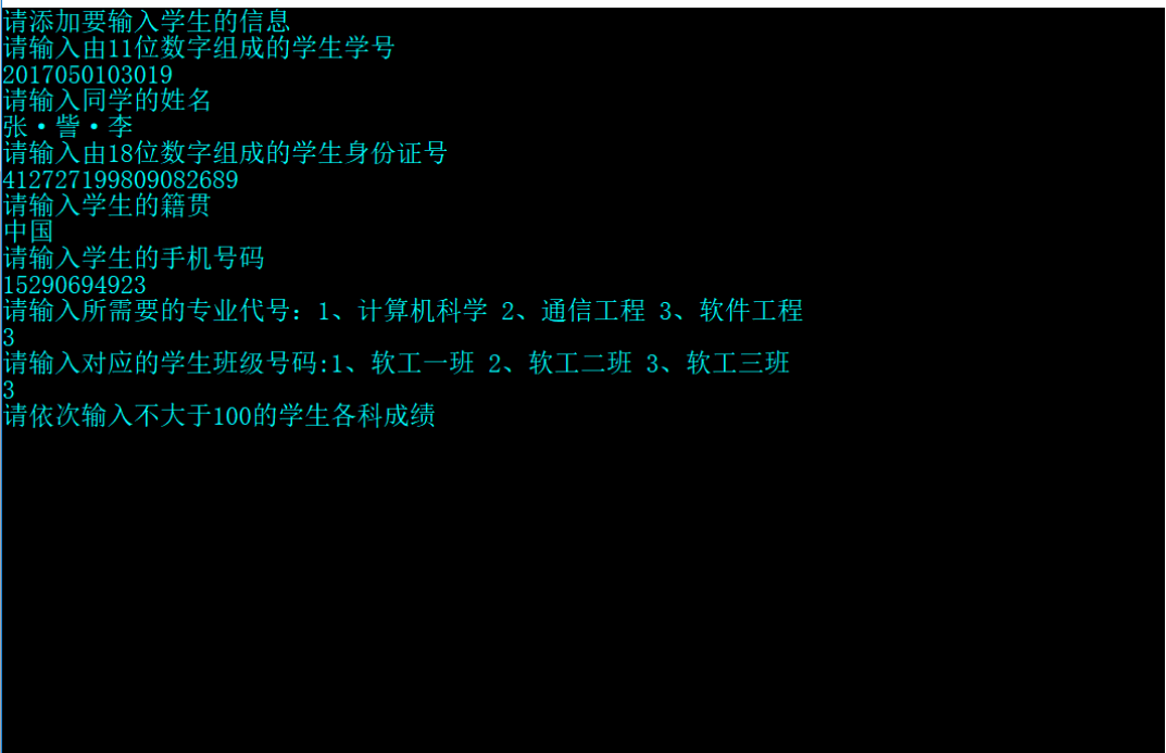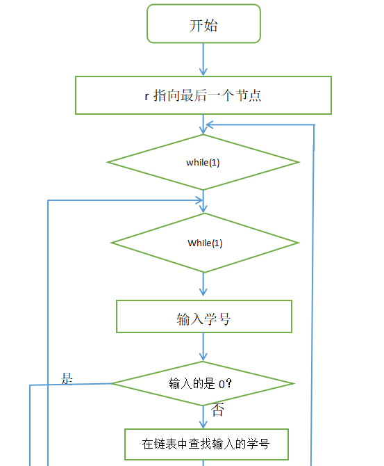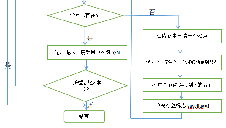 该函数用于输入学生信息,先将指针移动到链表的末尾,新加入的学生信息放在链表的末尾。因为系统中不会有两个相同学好的学生,录入数据时,首先判断输入的学号是否已经存在,如果用户录入了已经存在的学号,则给用户提示重新录入。学号正常后,则申请节点空间,录入其他数据项,再将该节点加入的链表的末尾。