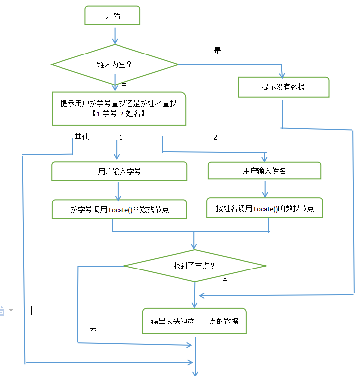 该函数是先按学号或按姓名查找。根据用户的输入确定按什么查找,在这里调用前面已定义的locat( )函数即可实现查询,然后将查询到的结果显示出来。
