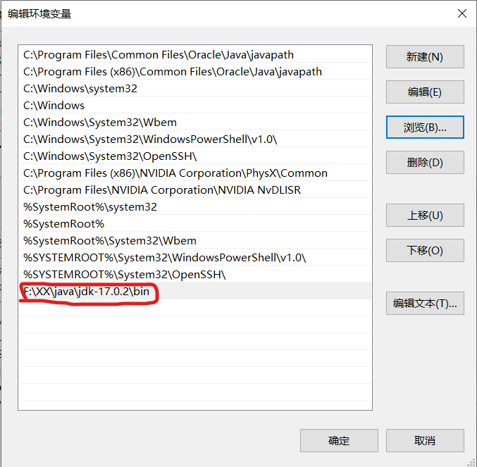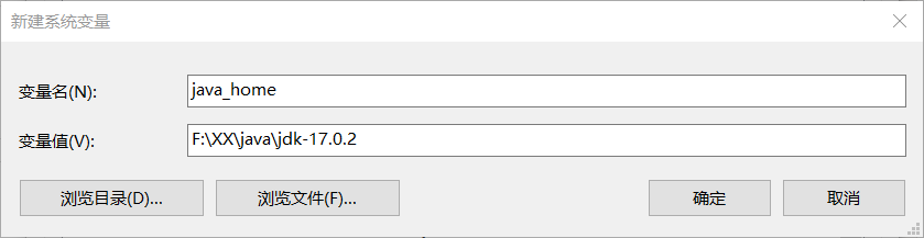 推荐在C盘意外的盘符给java一个单独的文件夹,这里演示的安装位置为F:\XX\java\jdk-17.0.2\