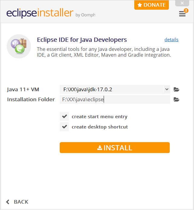 - 选择安装目录(第二个路径),第一个路径为JDK的安装文件夹,正常情况下默认就是正确的,不需要更改,选择好安装路径后点击“INSTALL”