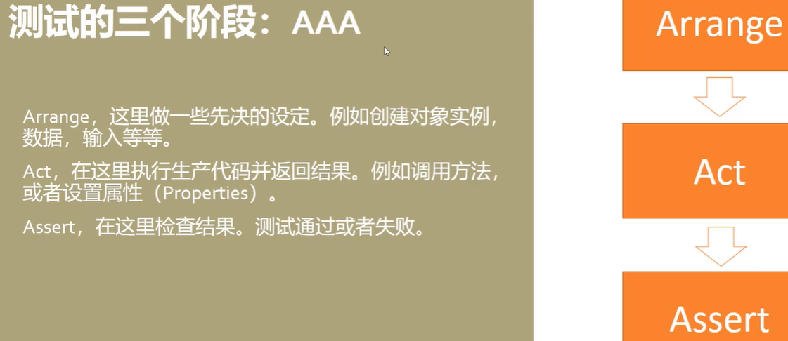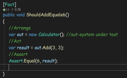 {[Fact]public void ShouldAddEquals5() //注意命名规范{//Arrangevar sut = new Calculator(); //sut-system under test,通用命名//Actvar result = sut.Add(3, 2);//AssertAssert.Equal(5, result);}