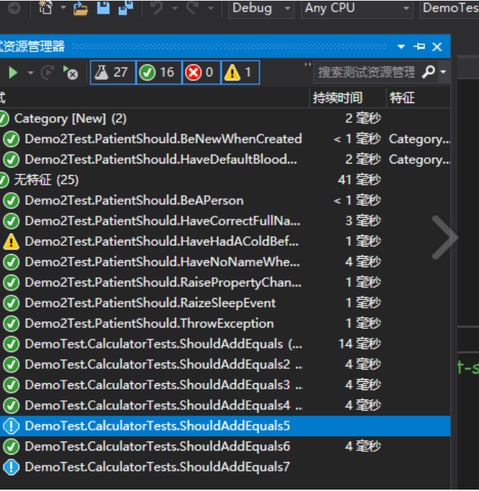 [Fact] [Trait("Category", "New")] public void HaveDefaultBloodSugarWhenCreated() { var p = new Patient(); var bloodSugar = p.BloodSugar; Assert.Equal(4.9f, bloodSugar,5); //判断是否相等 Assert.InRange(bloodSugar, 3.9, 6.1);//判断是否在某一范围内 }