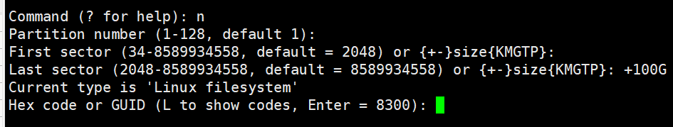 分区号和起始扇区默认即可,输入需要分区的大小