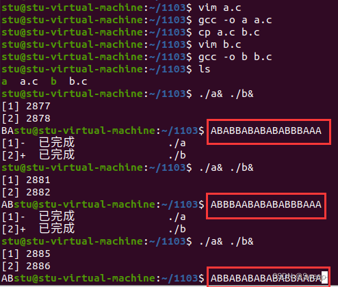 - (由于打印机同一时刻只能被一个进程使用,所以输出结果不应该出现abab这样交替的结果)。