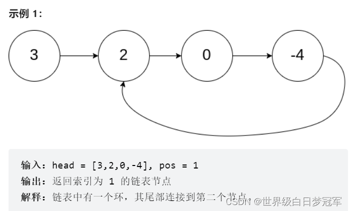 给定一个链表的头节点 head ,返回链表开始入环的第一个节点。 如果链表无环,则返回 null。 如果链表中有某个节点,可以通过连续跟踪 next 指针再次到达,则链表中存在环。 为了表示给定链表中的环,评测系统内部使用整数 pos 来表示链表尾连接到链表中的位置(索引从 0 开始)。如果 pos 是 -1,则在该链表中没有环。注意:pos 不作为参数进行传递,仅仅是为了标识链表的实际情况。 不允许修改 链表。