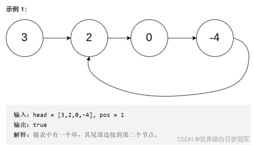 给你一个链表的头节点 head ,判断链表中是否有环。 如果链表中有某个节点,可以通过连续跟踪 next 指针再次到达,则链表中存在环。 为了表示给定链表中的环,评测系统内部使用整数 pos 来表示链表尾连接到链表中的位置(索引从 0 开始)。注意:pos 不作为参数进行传递 。仅仅是为了标识链表的实际情况。 如果链表中存在环 ,则返回 true 。 否则,返回 false 。