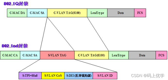 同时标准中对S-VLAN的TCI位修改为DEI(Drop Eligible Indicator),丰富了QoS特性,当用户报文进入运营商网络时会打上以88a8标识的外层标签,在离开运营商网络时会剥离这个外层标签。