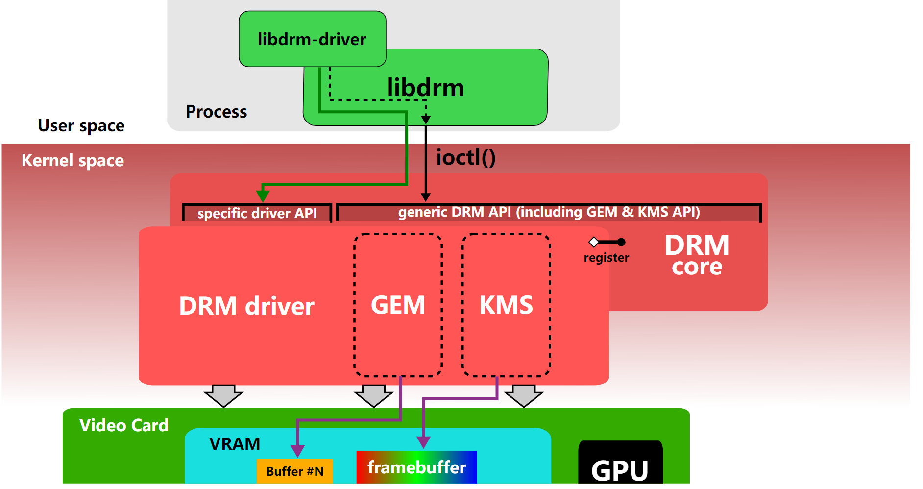 DRM由两部分组成:一个通用的“DRM core”和一个特定的“DRM driver”(用于支持某种特定类型的硬件)。DRM core提供了一个基础框架,DRM driver可以向其注册;core也向用户空间提供了一组最小集的ioctl,这些ioctl具有通过性功能的ioctl,独立于任何特定硬件。而DRM driver,要去实现依赖于特定硬件的 DRM API部分,这和driver所支持的特定GPU硬件相关;而且,它应该提供DRM core没有实现的剩余部分的ioctl。DRM driver也可以扩展API,提供额外的ioctl(只用于它支持的这个特定硬件)。当某DRM driver提供了扩展API时,用户空间的libdrm可通过一个额外的libdrm-driver来对应扩展,用户空间程序可以用这个libdrm-driver来与扩展的ioctl接口交互。