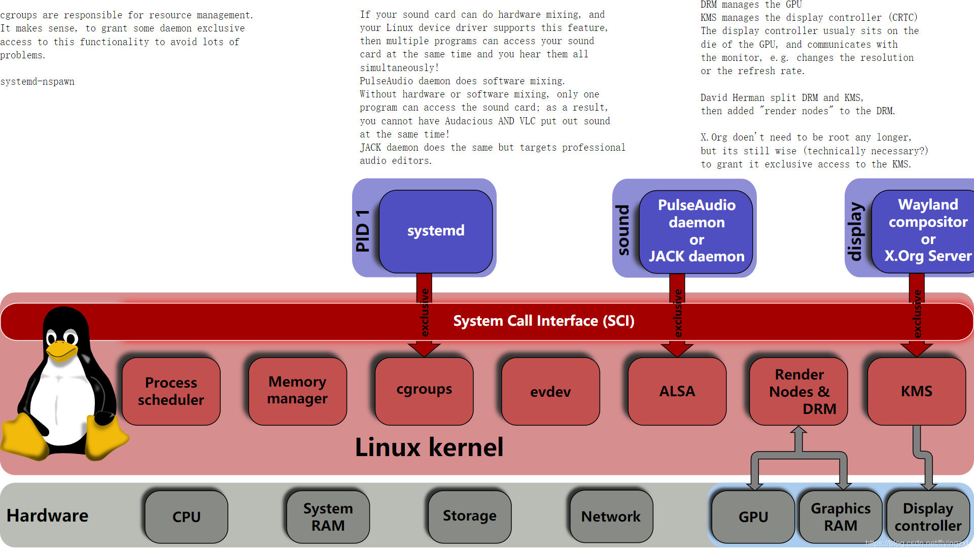 虽然Linux内核已经有了fbdev,用于管理图形适配器的framebuffer,但是这不能满足带有3D加速功能和GPU的现代视频硬件的需求。这些设备通常需要在自己的内存中设置和管理命令队列,以便将命令分发给GPU,并且还需要管理buffer的申请和释放。早前,用户空间程序(如X Server)直接管理这些资源,但是他们的软件行为表现得好像它们是上层唯一访问这些资源的程序。当多个上层程序在同一时间,按各自的方式设置和控制同一视频硬件资源时,会出现灾难性后果。