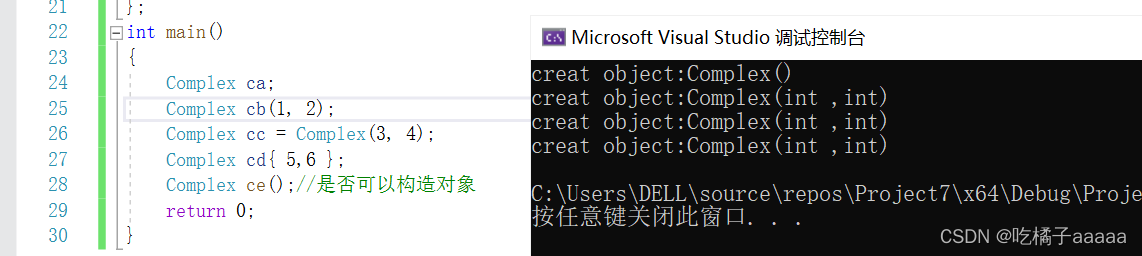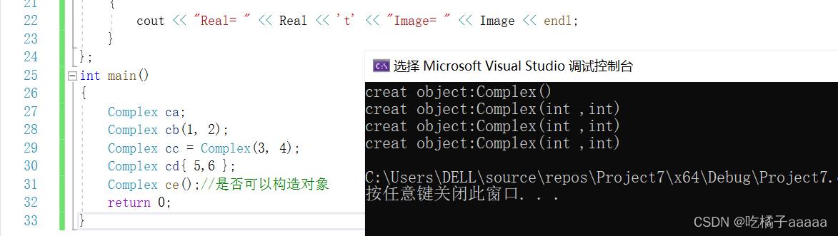 {Complex ca;Complex cb(1, 2);Complex cc = Complex(3, 4);Complex cd{ 5,6 };Complex ce();//是否可以构造对象return 0;