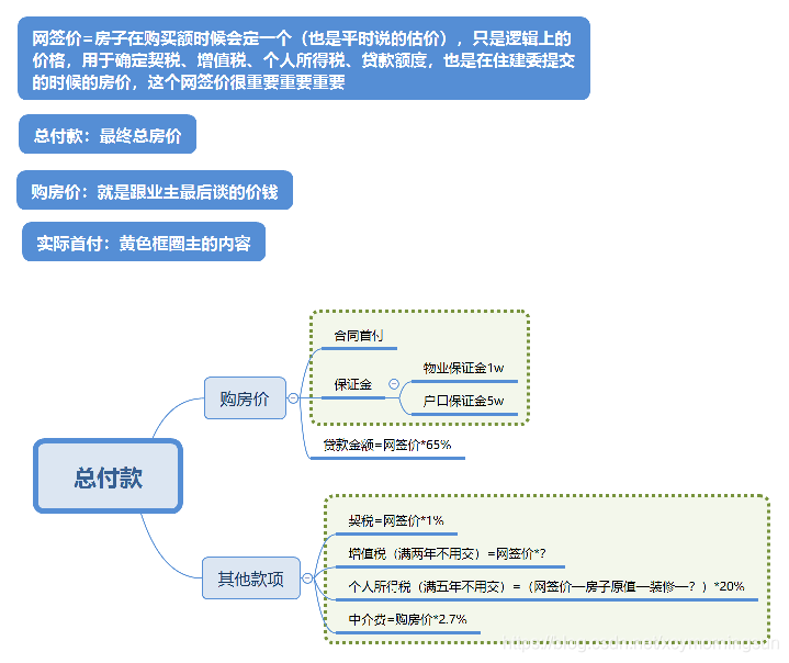 这里主要是定一个网签价的问题,网签价可以在一定范围内浮动,因为如果房子不满五唯一的话要交个人所得税,不满两年要交增值税,契税必须交的。比如我买的满二的,只用交契税和个人所得税,黄色框为实际首付,通过上述公式可以看出网签价越高的话交的个人所得税越高,可贷款数越多,实际首付整体需要变少【首付=购房价-网签价*65%+其他款项(只算个税约为网签价*20%),是网签价的递减函数,网签价越高实际首付越低】;网签价越低个人所得税越低,可贷款数越少,实际首付增加。