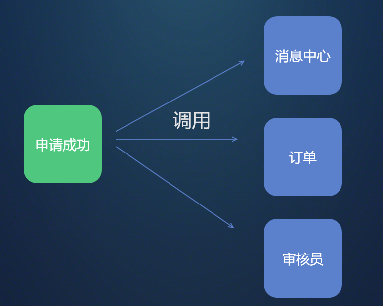 还是上面有提到过的设备申请模块,现在你要实现一个设备申请功能,需求要求申请成功后,会分别触发供应商订单生成,相关方消息通知,审核人审核三块的逻辑,调用逻辑如下图。