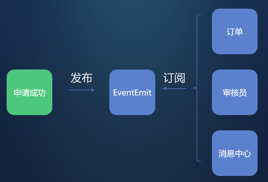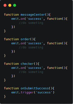 基于这些问题的考虑,我们必须让程序更灵活一些。在写onSubmitSuccess函数的时候,我们只需要考虑结束时发通知出去告知申请成功,至于谁需要这个消息做什么并不需要关系。借助发布订阅模式,可以很轻松的实现这种效果。
