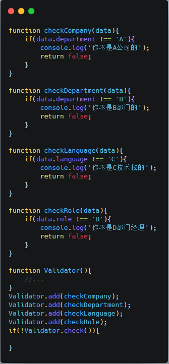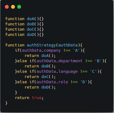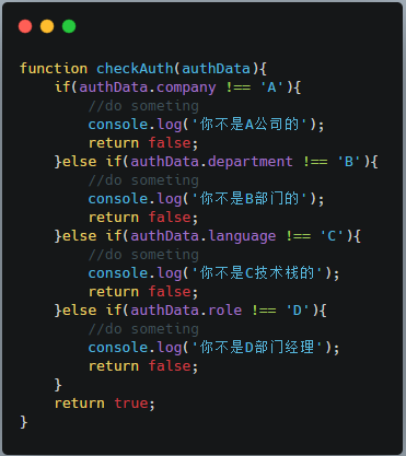 1.当条件越来越多时,checkAuth函数会越来越长,可读性以及可维护性相当的差。上面例子中,省略了具体判断中的处理代码,如果每个分支的处理代码都不少,那整个checkAuth函数最后会变得非常复杂。