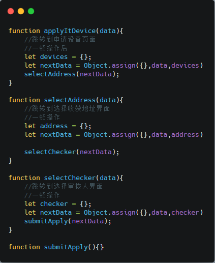 2.当你在写设备申请的onSubmitSuccess函数的时候,需求只依赖函数中这三个模块,但随着业务发展,你需要调用的模块在增加,这时你就不得不再次找到这个onSubmitSuccess函数往里面添加依赖项。