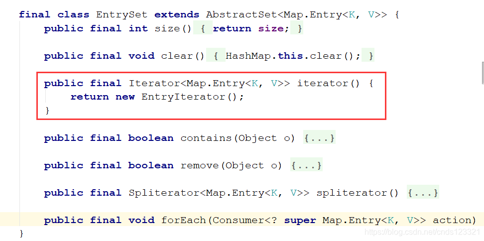 查看EntrySet类源码,里面有个iterator()方法,字节码文件中调用的就是该iterator()方法
