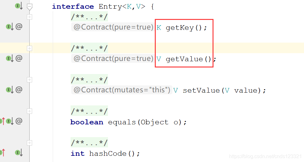 /*** 该方法返回值就是这个map中各个键值对映射关系的集合* 1.Map中采用Entry内部类来表示一个映射项,映射项包含Key和Value* 2.Map.Entry里面包含getKey()和getValue()方法** @return 返回map中各个键值对映射关系的集合*/public Set<Map.Entry<K, V>> entrySet() {Set<Map.Entry<K, V>> es;return (es = entrySet) == null ? (entrySet = new EntrySet()) : es;/*等价于(代码复杂化)Set<Map.Entry<K, V>> es = entrySet;if (es == null) {entrySet = new EntrySet();return entrySet;} else {return es;}*/}