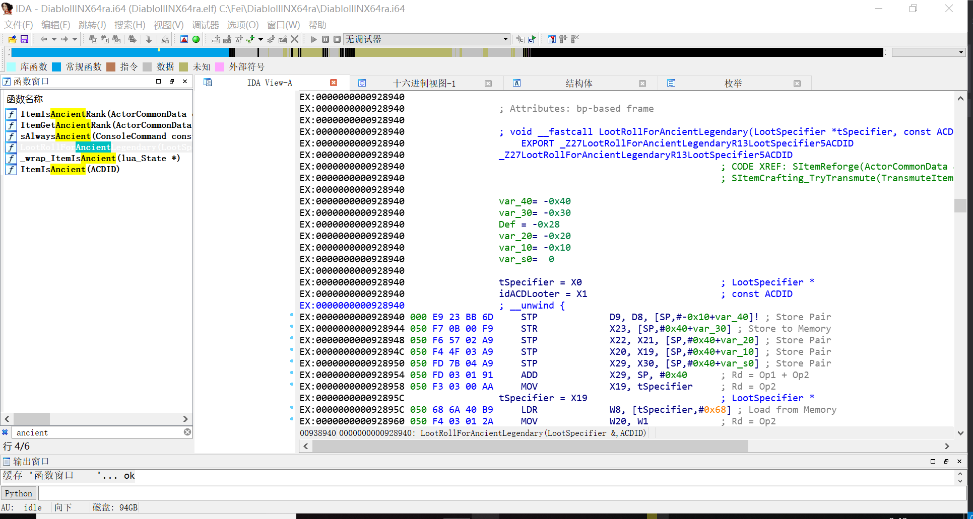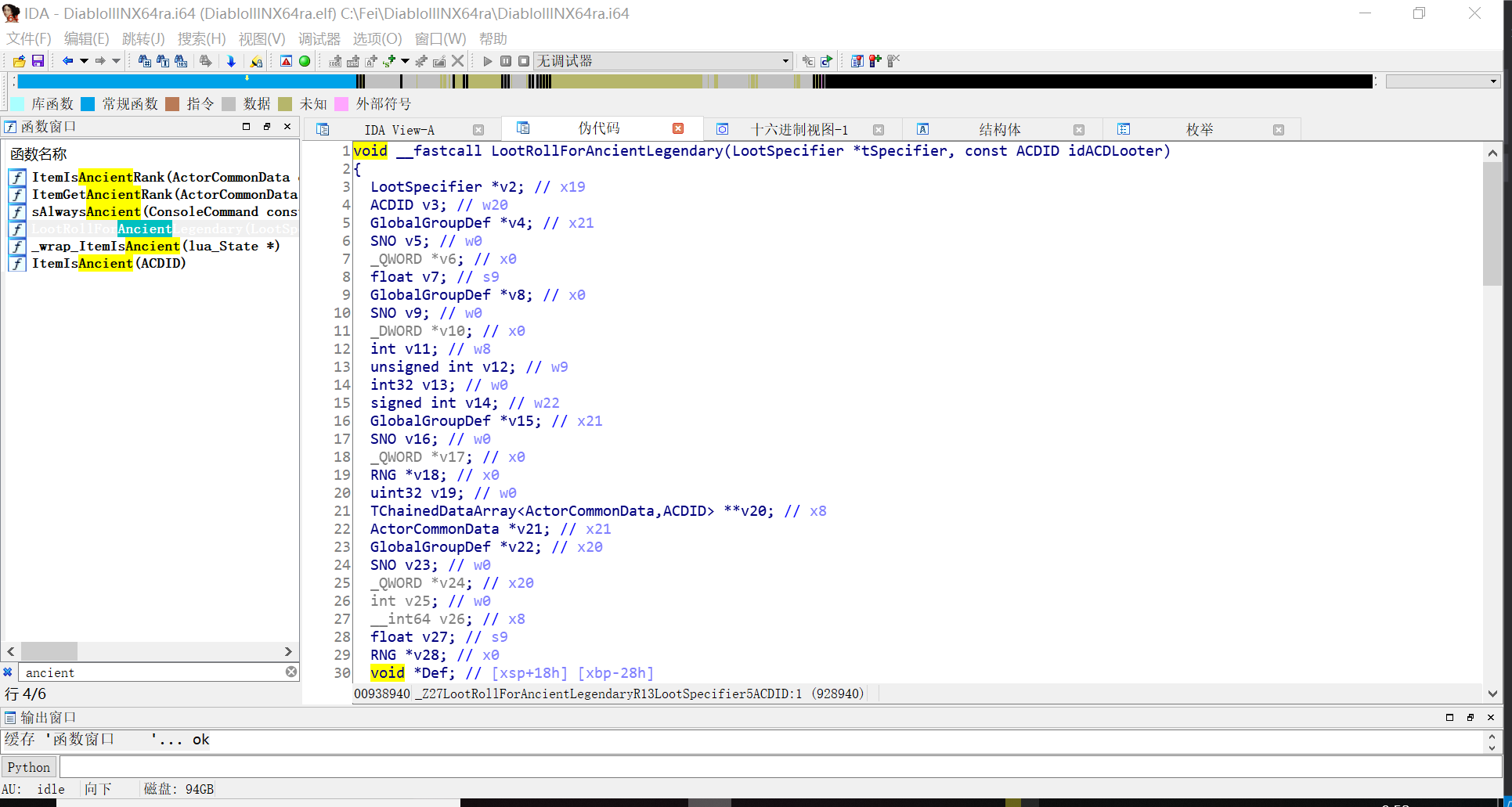 1. 运行神器IDA,然后打开原始版本的DiabloIIINX64ra.elf ,等待反汇编完成(因为带调试符号,时间可能比较长,请耐心等待,或者去做一些其他事情,大概在10分钟左右,与电脑配置有关,输出窗口显示内容不再更新代表已经完成),如果每次打开IDA窗口布局不对,或者少了一些窗口,建议点击窗口->重设窗口来复位一下布局。