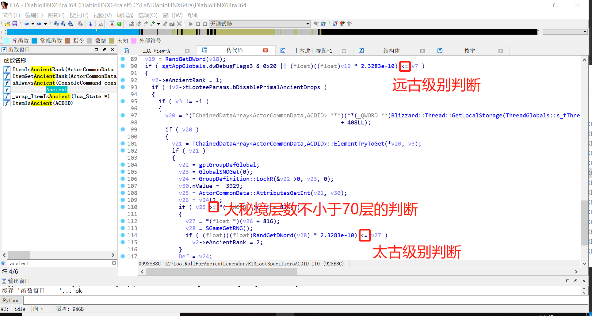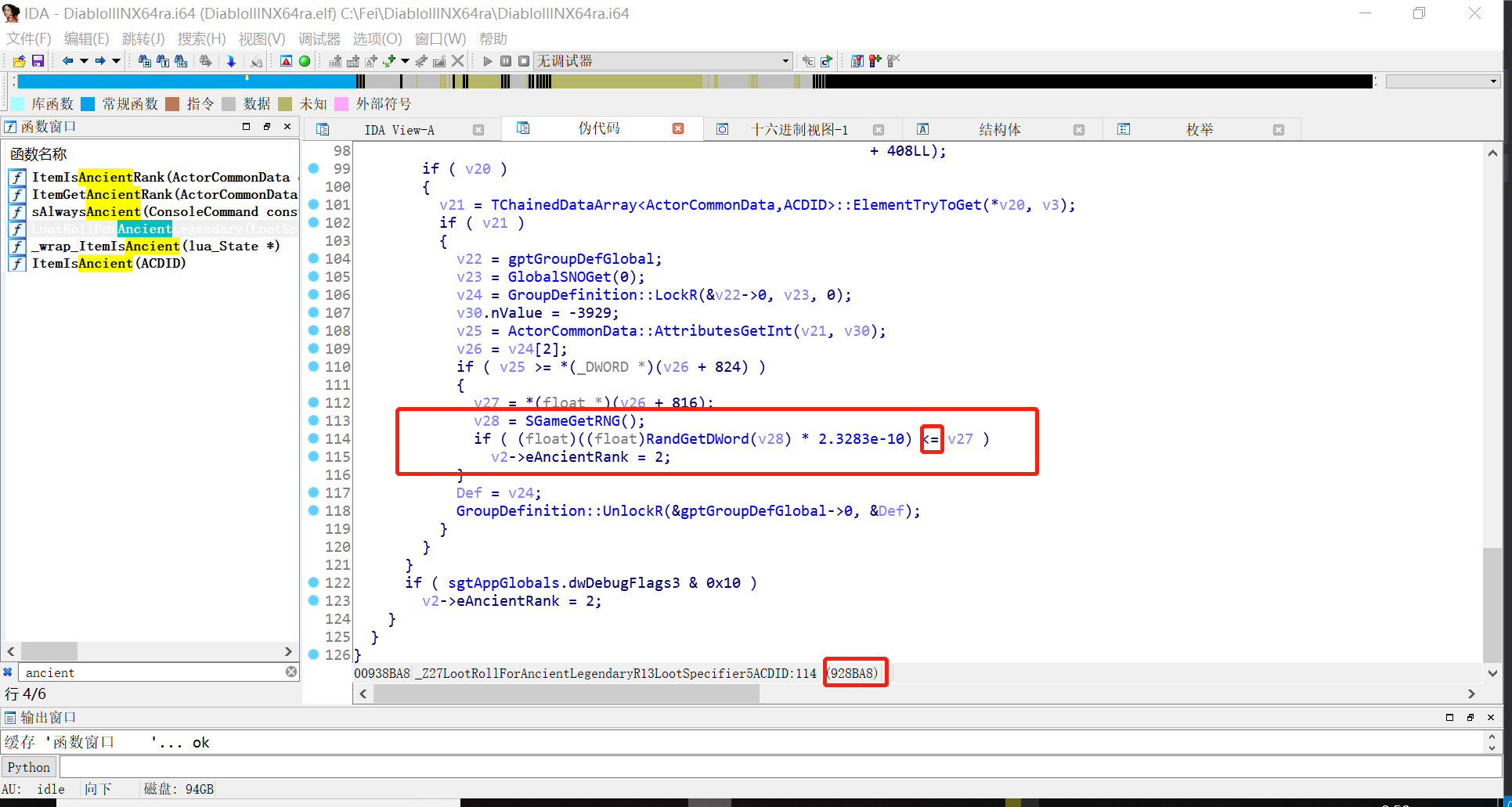 2. 我们要修改的是远古传奇掉落机制,所以要先搜索远古的英文ancient,首先点击左边函数窗口里任意一个函数,然后在编辑里点击快速筛选,然后左下方输入ancient,不出所料,筛选后的函数只剩下6个,分析一下名称,可以知道最有可能的是LootRollForAncientLegendary这个函数,因为字面意思就是对战利品随机出远古传奇,然后我们双击这个函数,可以在右边的IDA View里看到这个函数的汇编代码