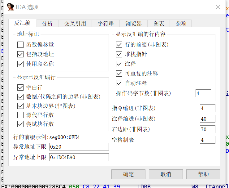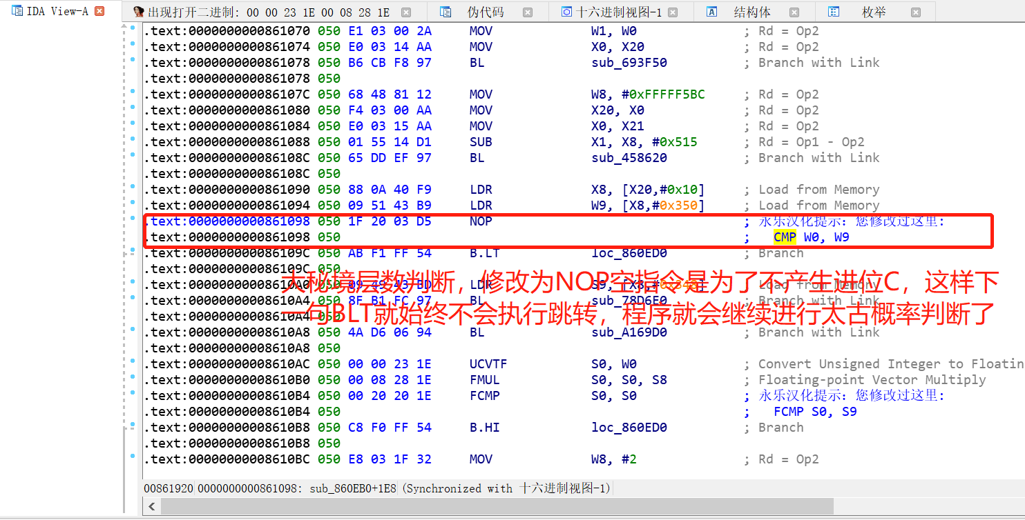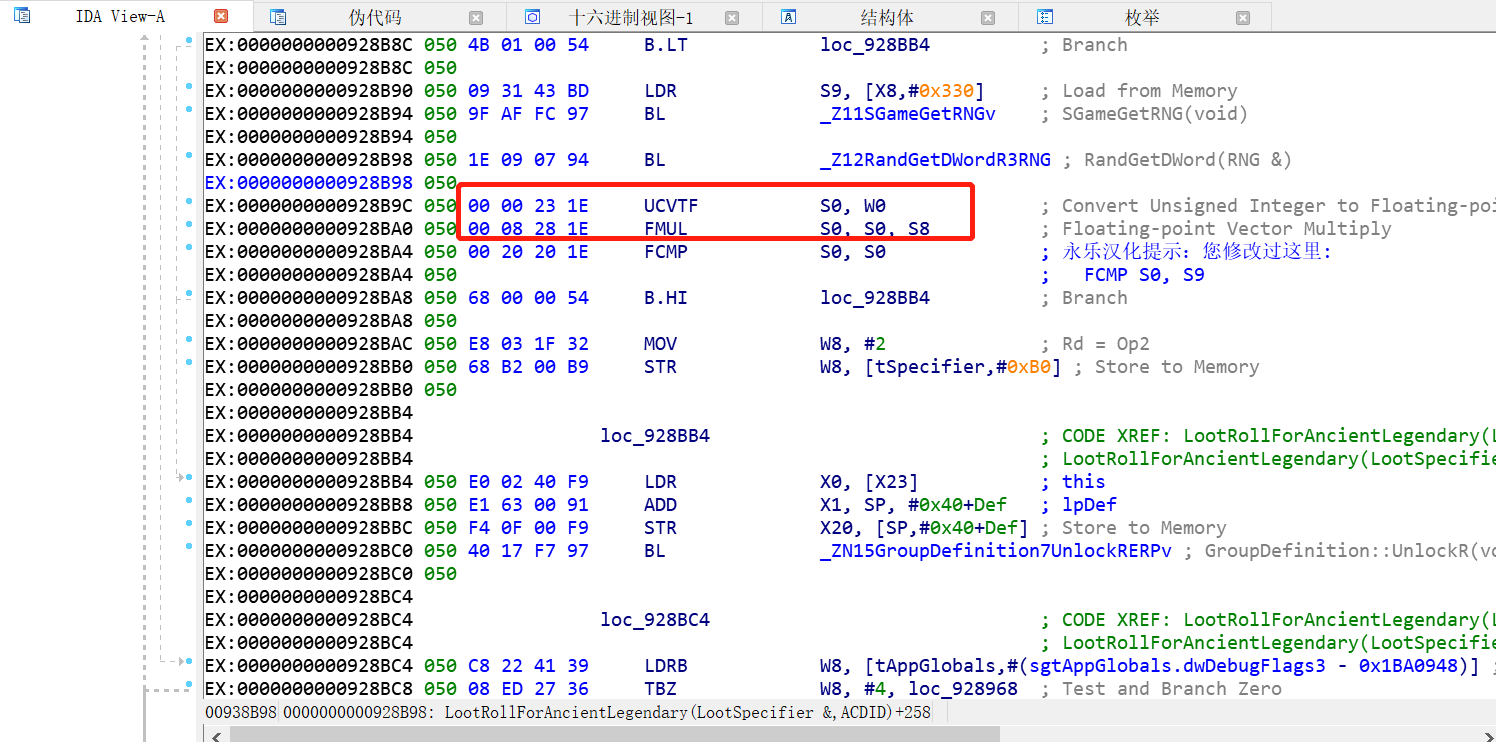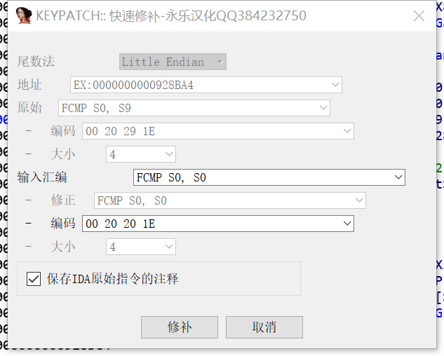 5. 在<=上点击一下,可以看到这个地址是928BA8,然后再点击IDA View, 点击跳转->跳转到指定地址里输入928BA8,就到了这里的汇编代码,我们要修改的就是928BA4上的FCMP S0, S9,原因就是当鼠标在v27这个变量上停留时,显示的就是s9,为了让下一句B.HI loc_928BB4 不跳转,我们可以在FCMP S0, S9上鼠标右键快速修补神器->修补,把原指令改为FCMP S0, S0, 这样结果始终相等,<=的条件就始终成立了,如果想在IDA View里显示指令字节码和注释,可以在选项->常规里按照下图配置一下就可以了