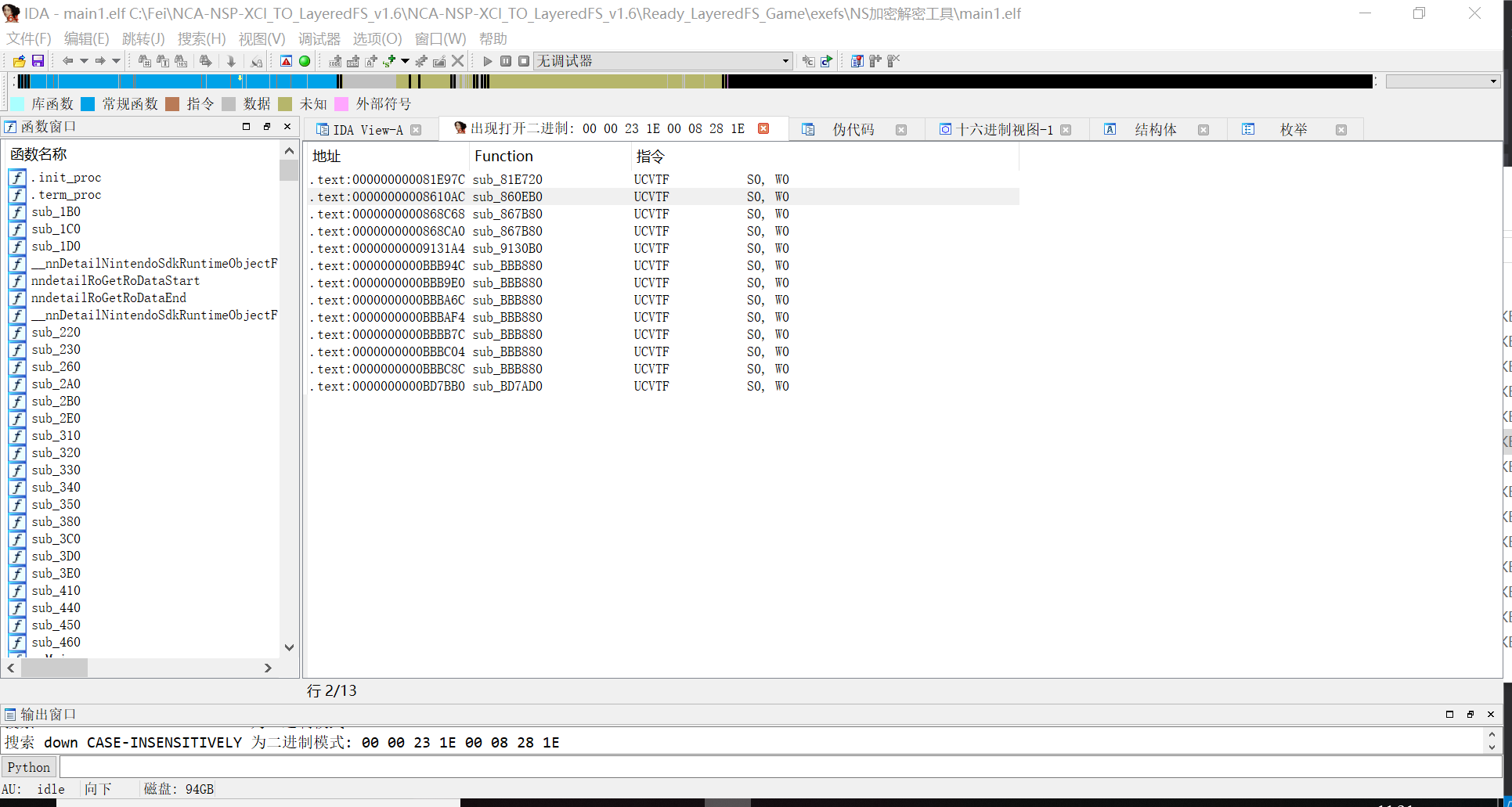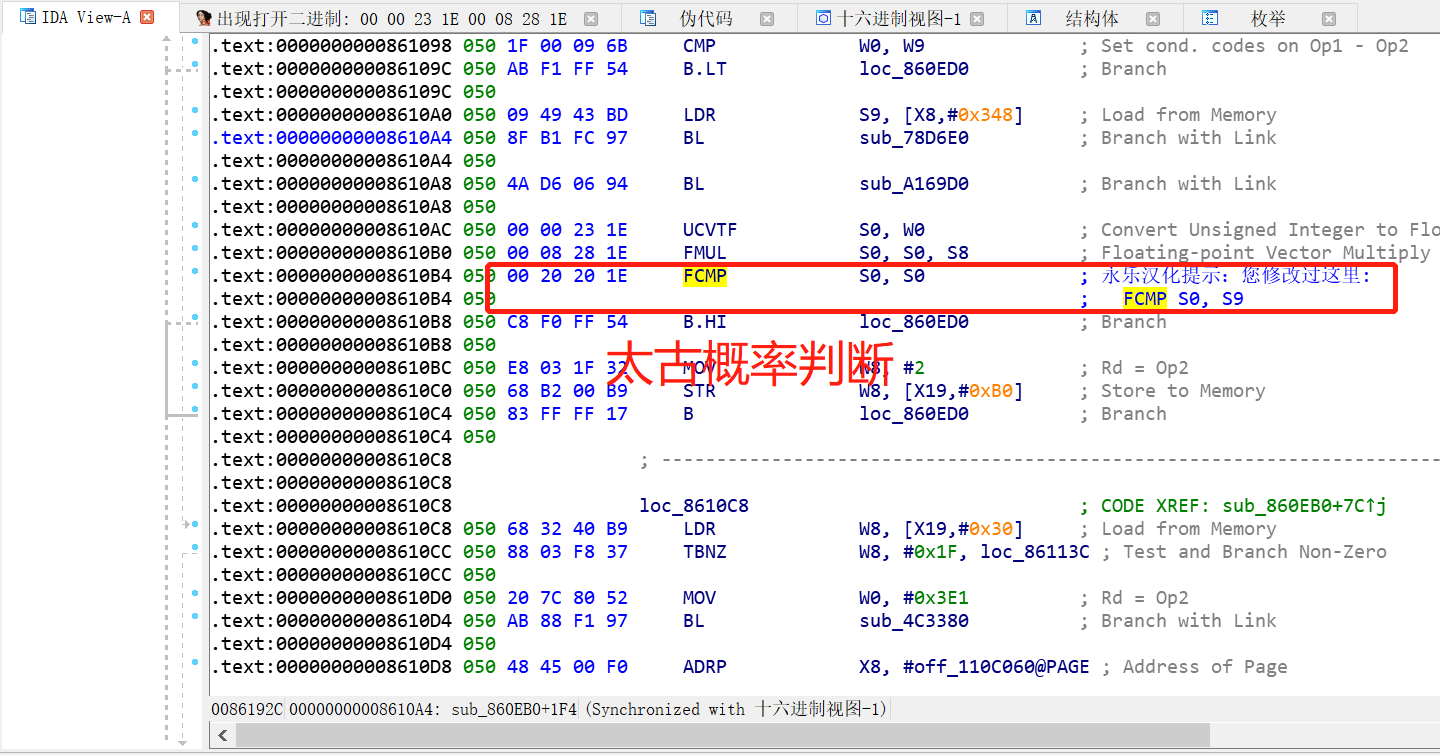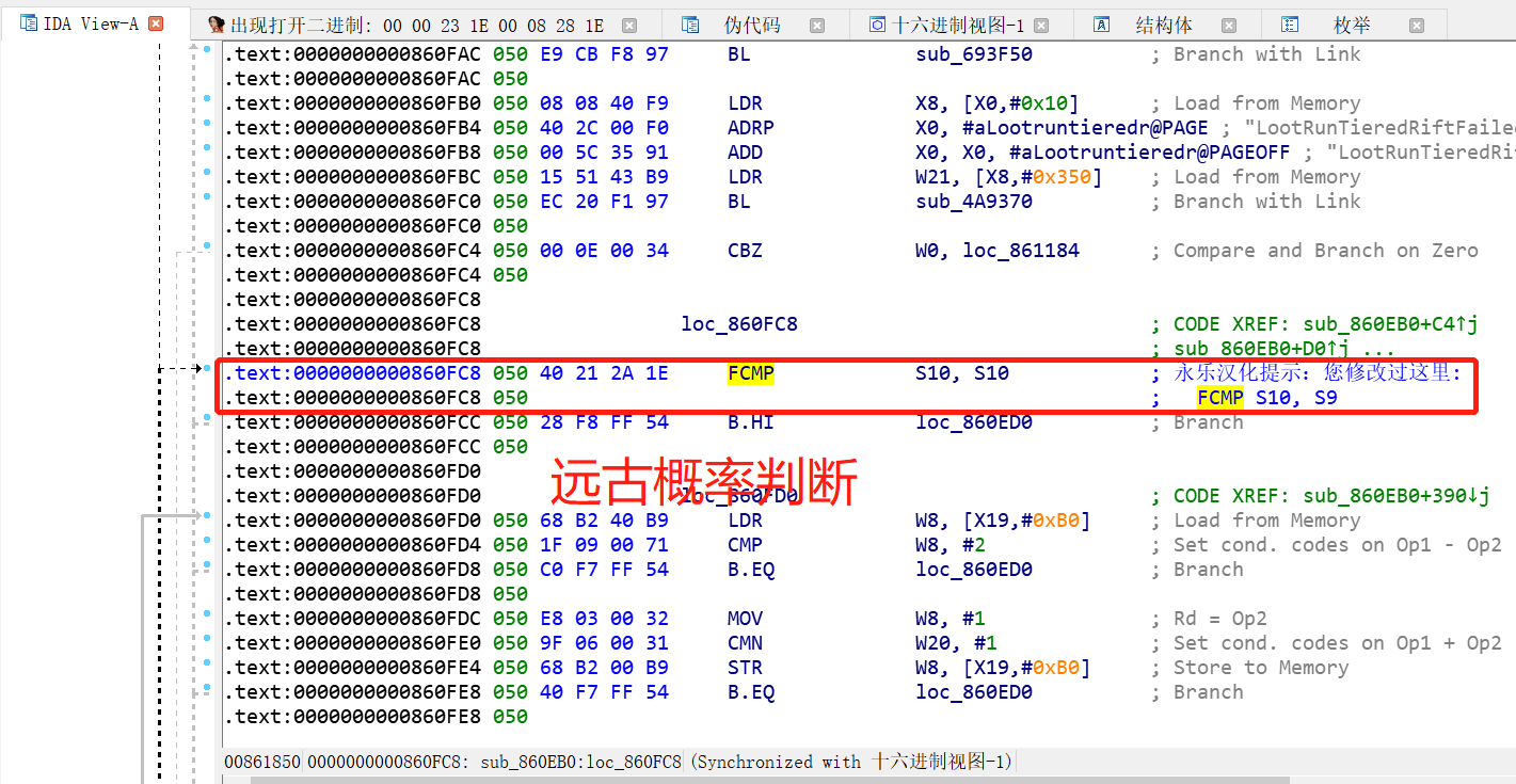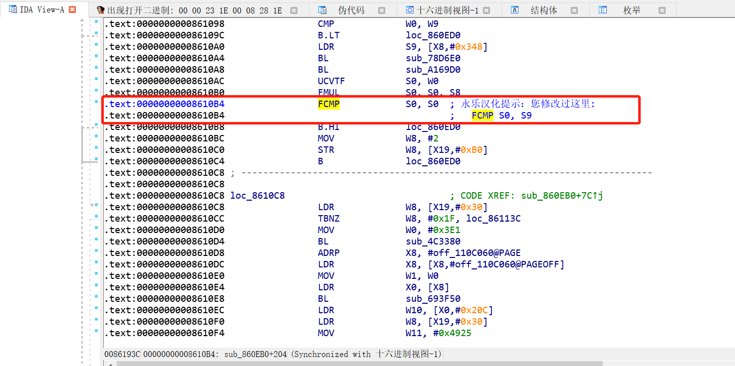 6. 修补之后,我们突然想到一个问题,现在是基于原始版本修改的,但是游戏已经是2.6.6版本了,怎么办?不用担心,我们可以采用另一种方法去找到2.6.6版本对应的地址,再次启动另外一个IDA实例,打开2.6.6的main.elf,搜索原始版本FCMP附近的指令字节码,可以是前面的,也可以是后面的,如果搜索不到,那就扩大范围,记住,尽量搜索一些不容易被改变的指令,比如常量等等, 我们就在2.6.6里面搜字节序列00 00 23 1E 00 08 28 1E 然后发现第二个搜索结果和原始版本附近的指令最相似,那么基本可以判断,第二个搜索结果就是2.6.6对应的地址啦,2.6.6对应的FCMP地址就是00000000008610B4,用同样的方法改成FCMP S0, S0