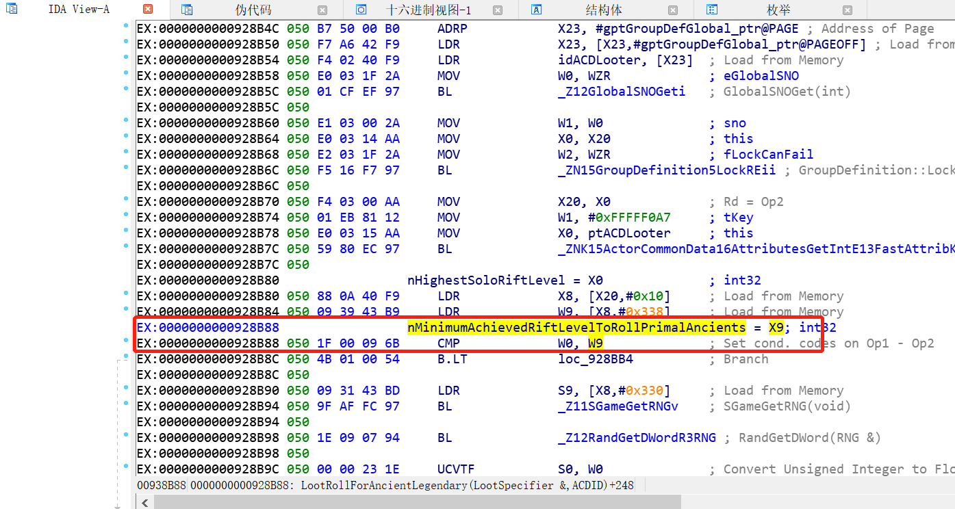 7. 目前为止,我们已经完成了太古级别判断的修改,那么还有一个问题,可以从伪代码分析中得知,要判断太古的话,首先这个掉落的传奇装备要先进行远古级别判断,成功后还要进行当前玩家Solo单人大秘境层数是否大于等于70的判断,大于70层才会进行远古级别的判断,因此,前两个条件同样需要修改成始终成立,转到汇编代码我们确实可以看到nMinimumAchievedRiftLevelToRollPrimalAncients和nHighestSoloRiftLevel的比较,也就是单人solo大秘境层数与生成太古装备所需最低层数的比较