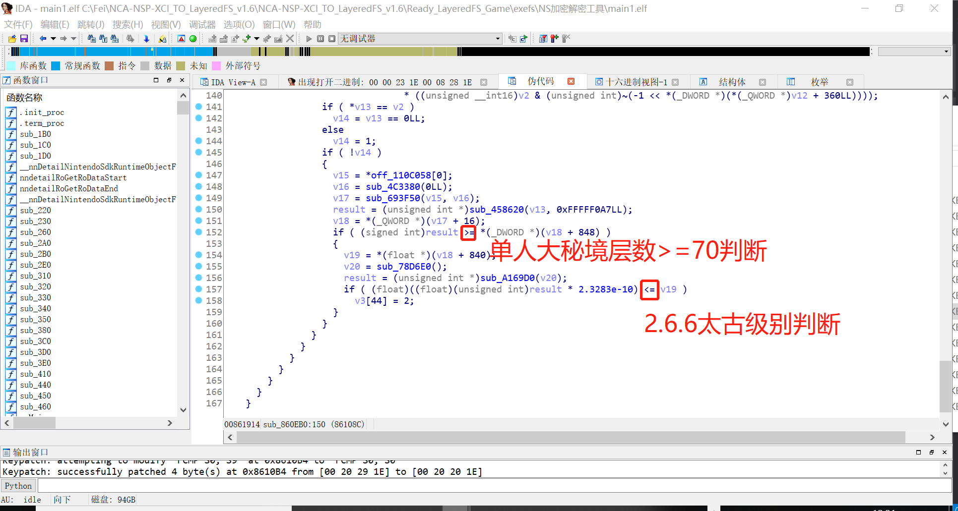 8. 知道了原始版本的远古太古以及层数判断,那么接下来我们可以去2.6.6版本的伪代码当中找到对应的地方,当然由于2.6.6的main不带调试信息,因此不太容易看,不过通过代码结构还是很容易分析出对应关系,但是我们暂时没找到远古的判断位置,只找到了后两个判断