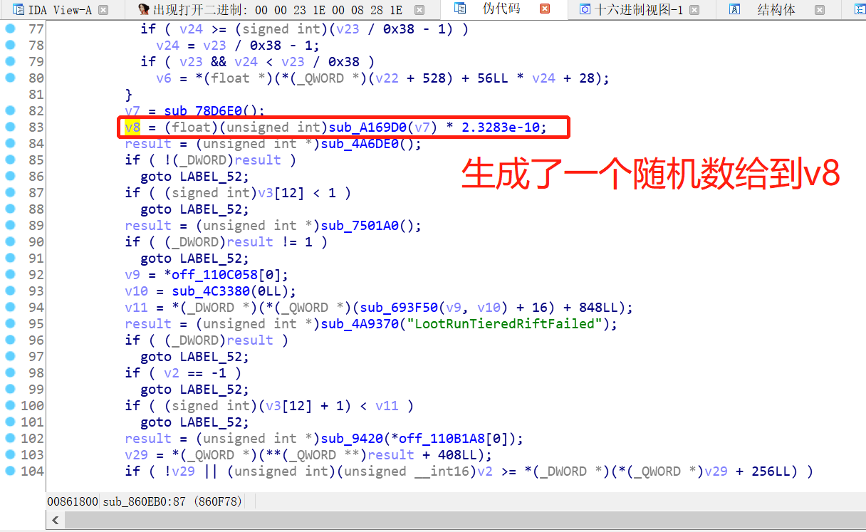 9. 不过这阻挡不了我们逆向的决心,伪代码往上面分析,我们看到了一个v8的变量乘了一个很小的数,因此分析出v8一定是远古判断的随机数