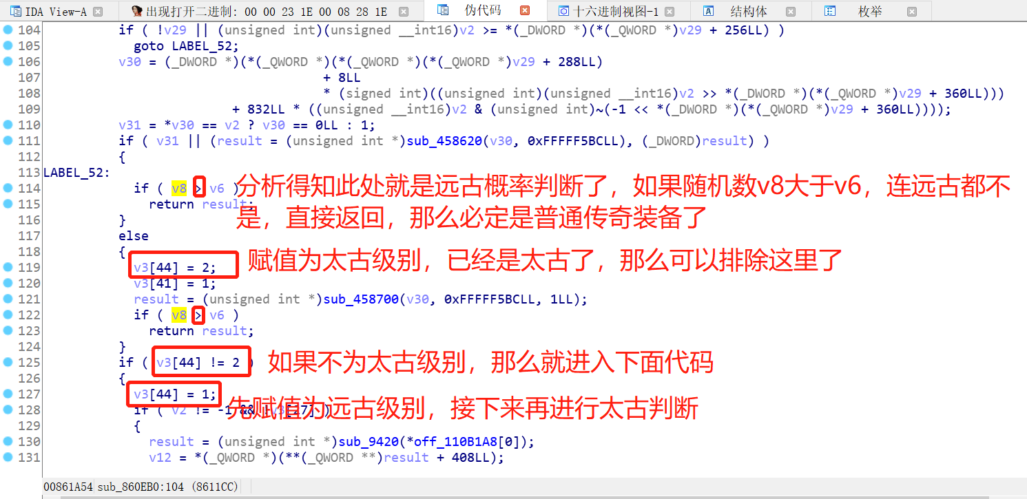 4. 沿着函数伪代码往下拉,在接近函数底部的时候我们发现了一些非常可疑的代码,if ( (float)((float)RandGetDWord(v28) * 2.3283e-10) <= v27 ) v2->eAncientRank = 2; 这一句非常重要,根据函数名,可以猜测这是获取一个随机数然后乘以一个小数后判断是否大于一个值,如果小于的话就把eAncientRank的值改为2,我们发现整个函数eAncientRank的值会被赋值成1或2,因此猜测eAncientRank的值如果是2的话就代表太古,1代表远古,于是可以从这个随机数判断上入手,可以让这个条件始终成立,那么eAncientRank就始终为2了,那么我们掉落的传奇是不是就一定是太古级别了呢?