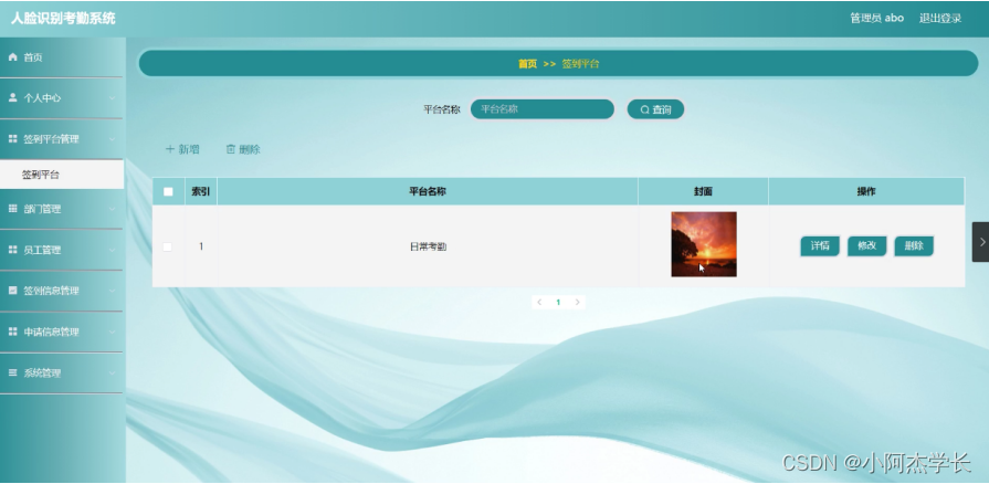 签到平台管理,在签到平台管理可以对索引,平台名称,封面等进行详情,修改和删除操作,如图4-9所示。